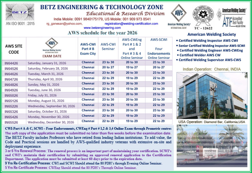 About BETZ: BETZ Engineering & Technology Zone is an accredited International Agency for American Welding society, Florida, USA, to conduct seminars and certification programs for AWS in India and worldwide. BETZ is an ISO 9001:2015 company, also BETZ is the Only “ATF –Accredited Test Facility” by AWS to evaluate and certify welders in India.